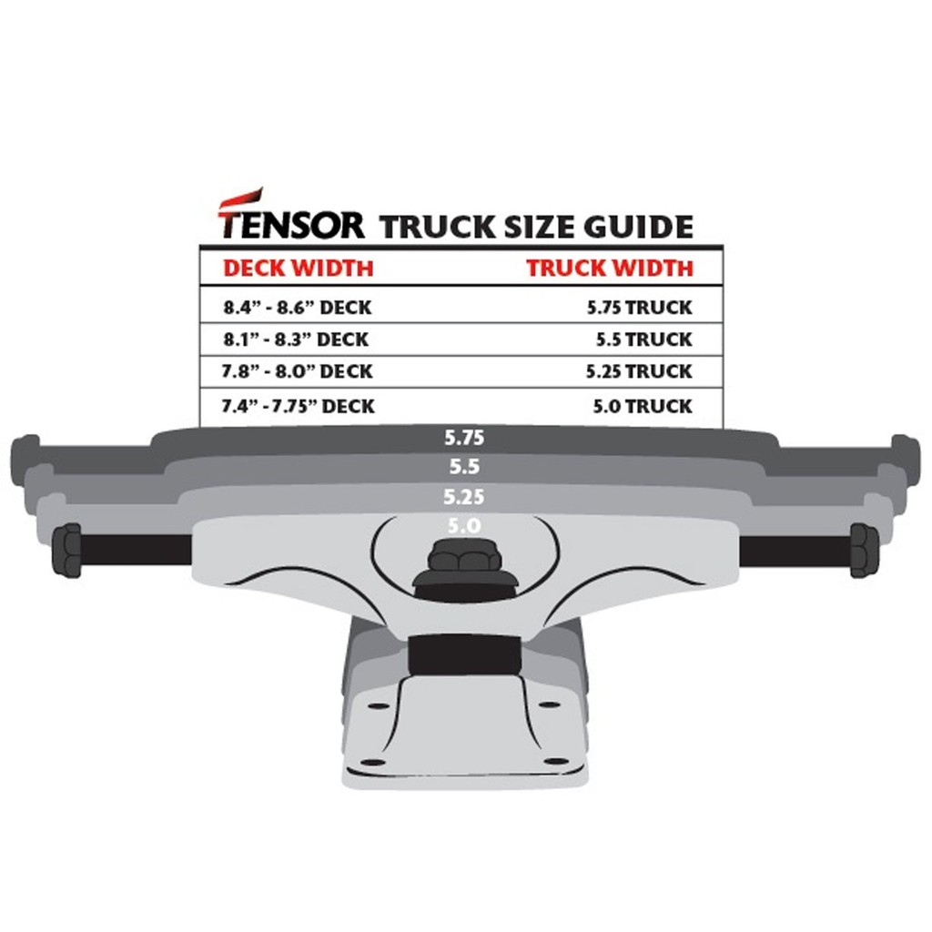5 rows Tensor Trucks Size Chart. 75 or larger - for all skaters over age 13. Shop the best selection of skateboard trucks from Tensor.